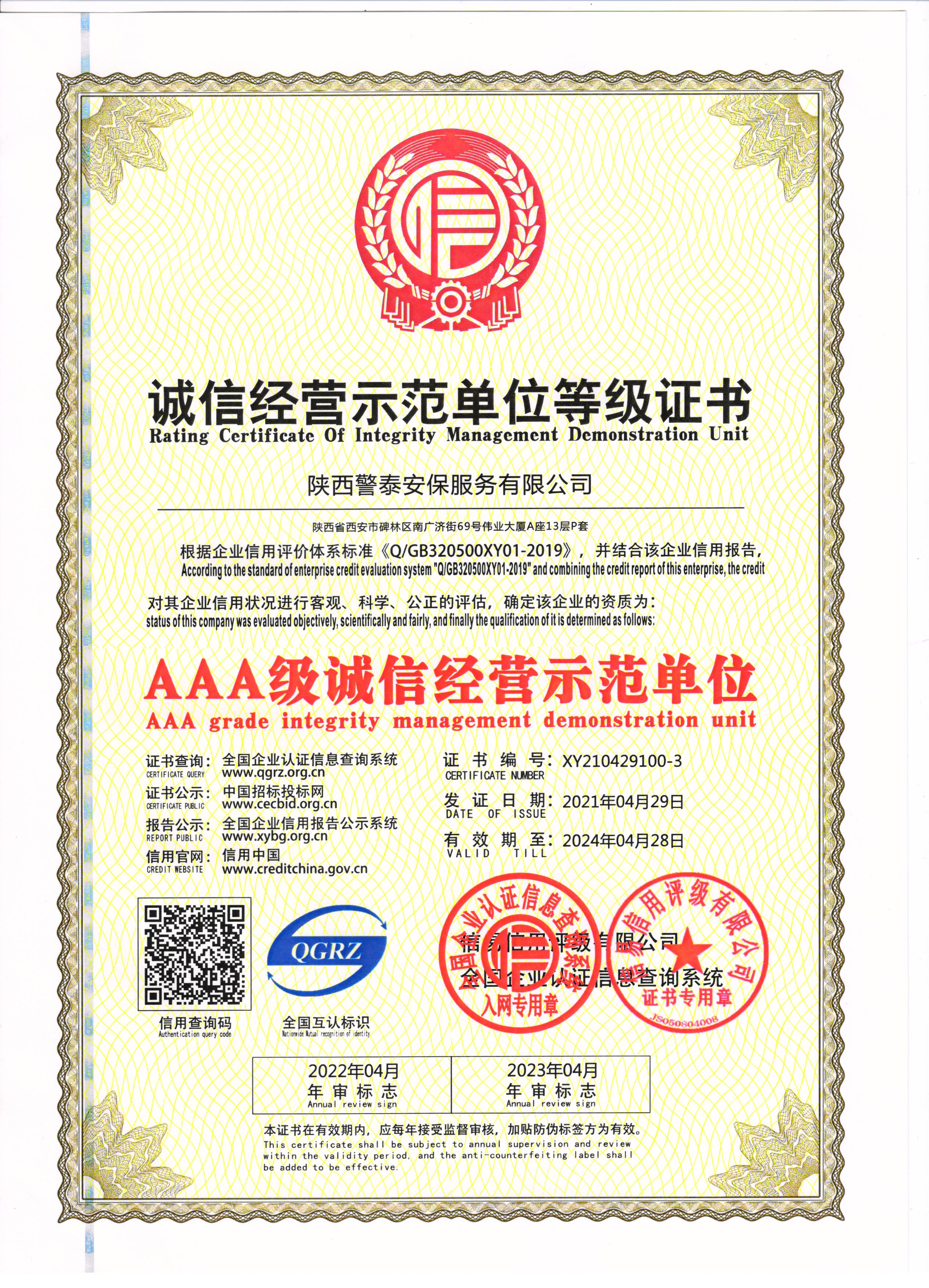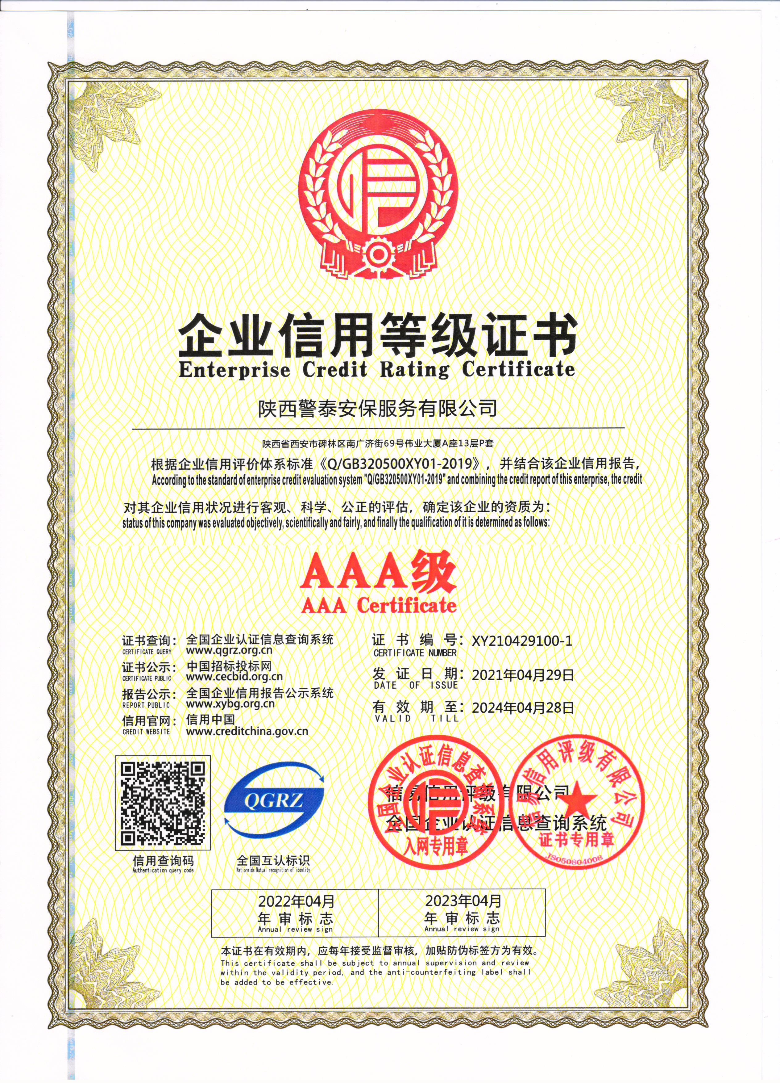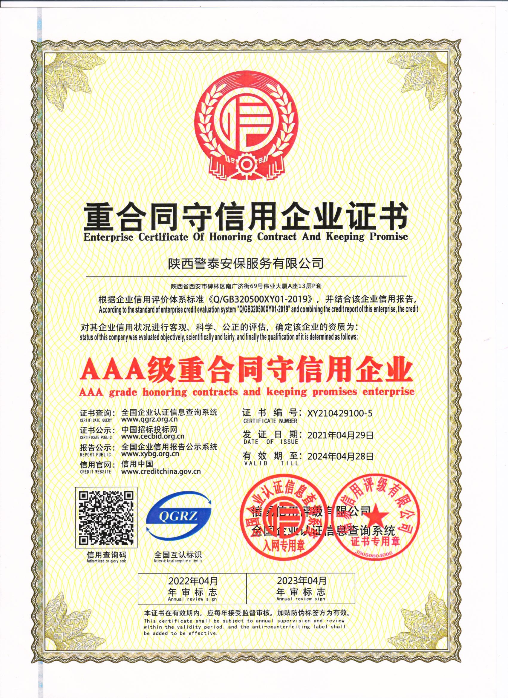 熱烈祝賀陜西警泰安保服務有限公司榮獲AAA級信