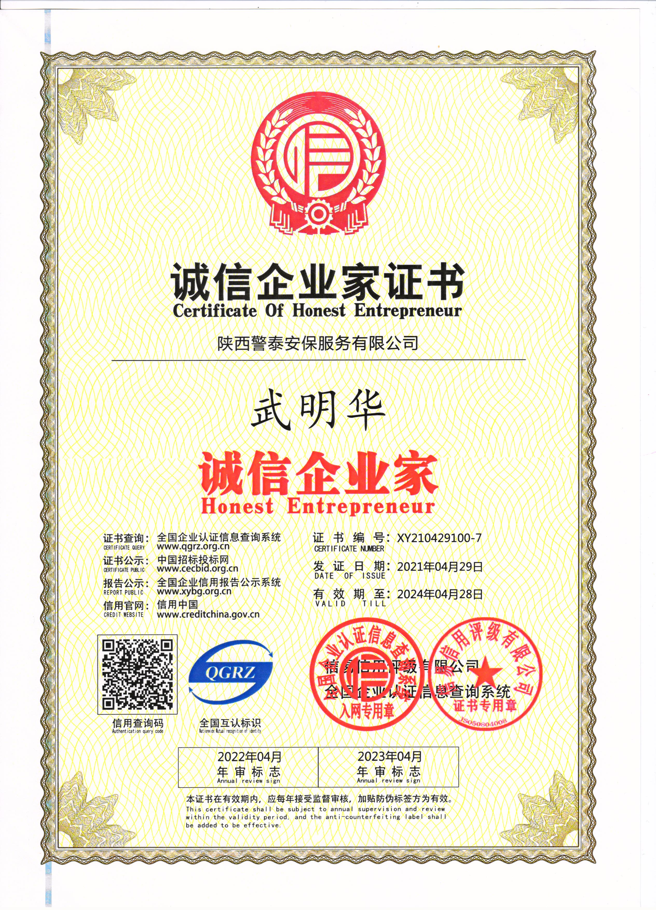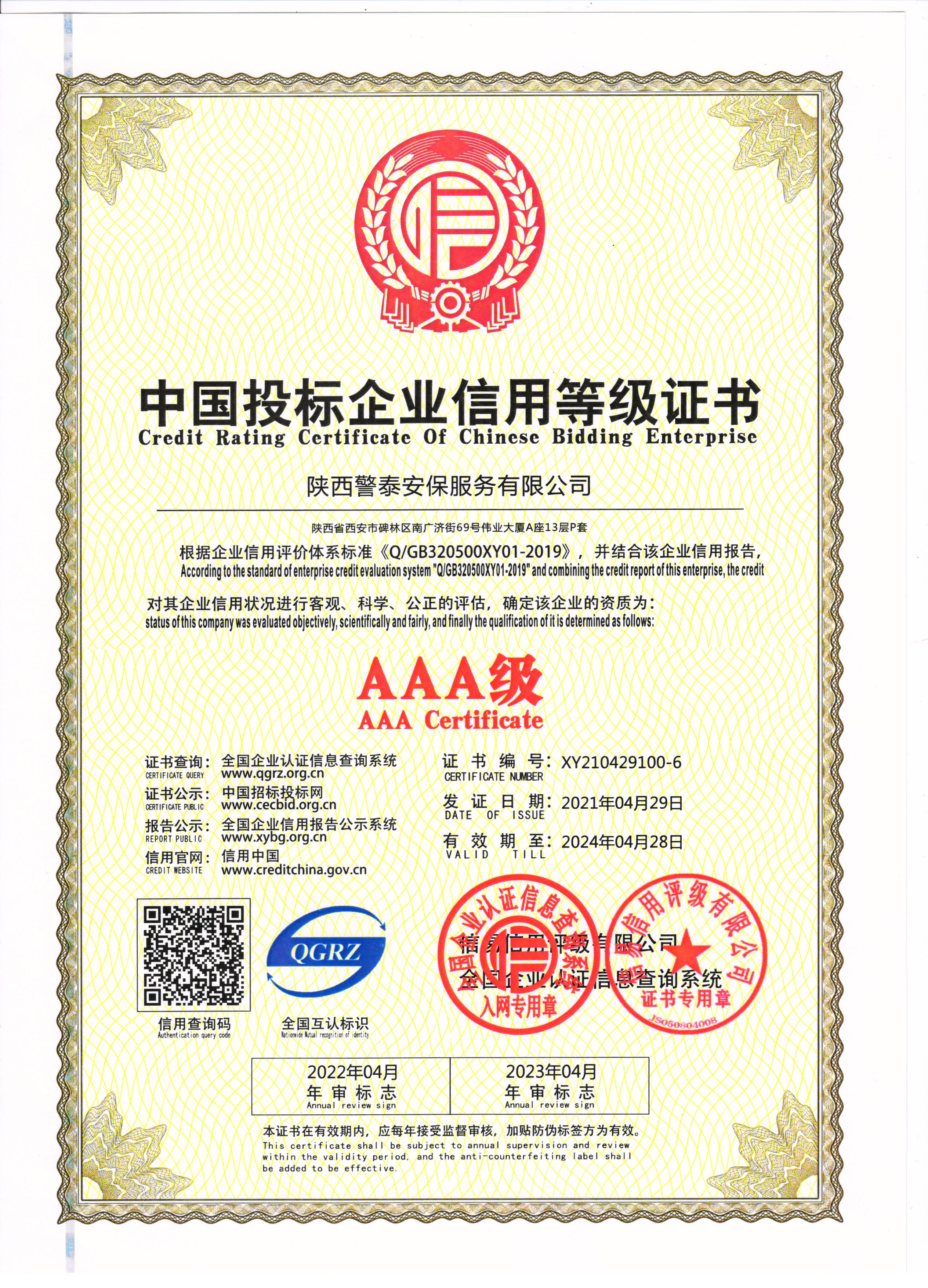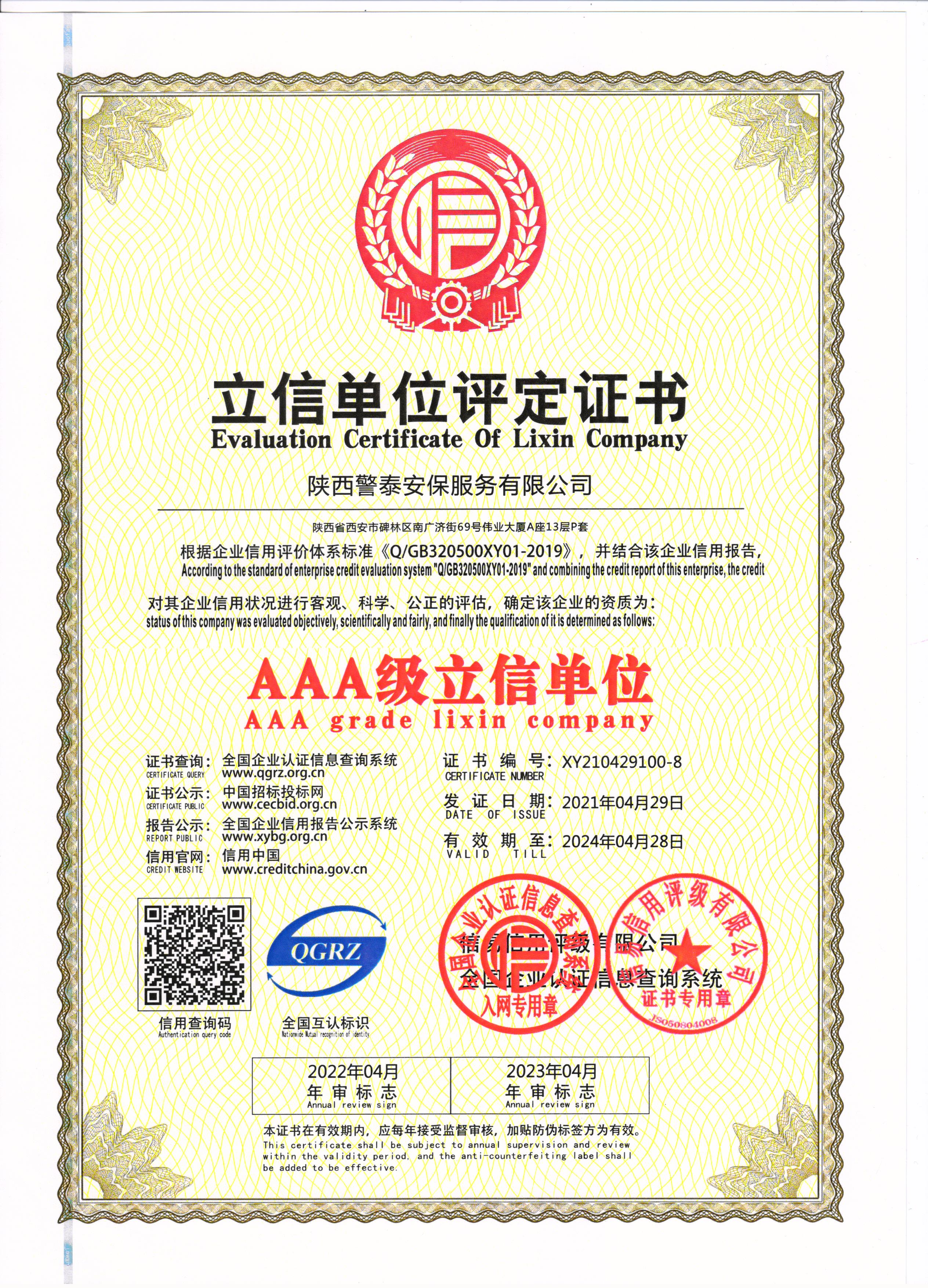 熱烈祝賀陜西警泰安保服務有限公司榮獲AAA級信