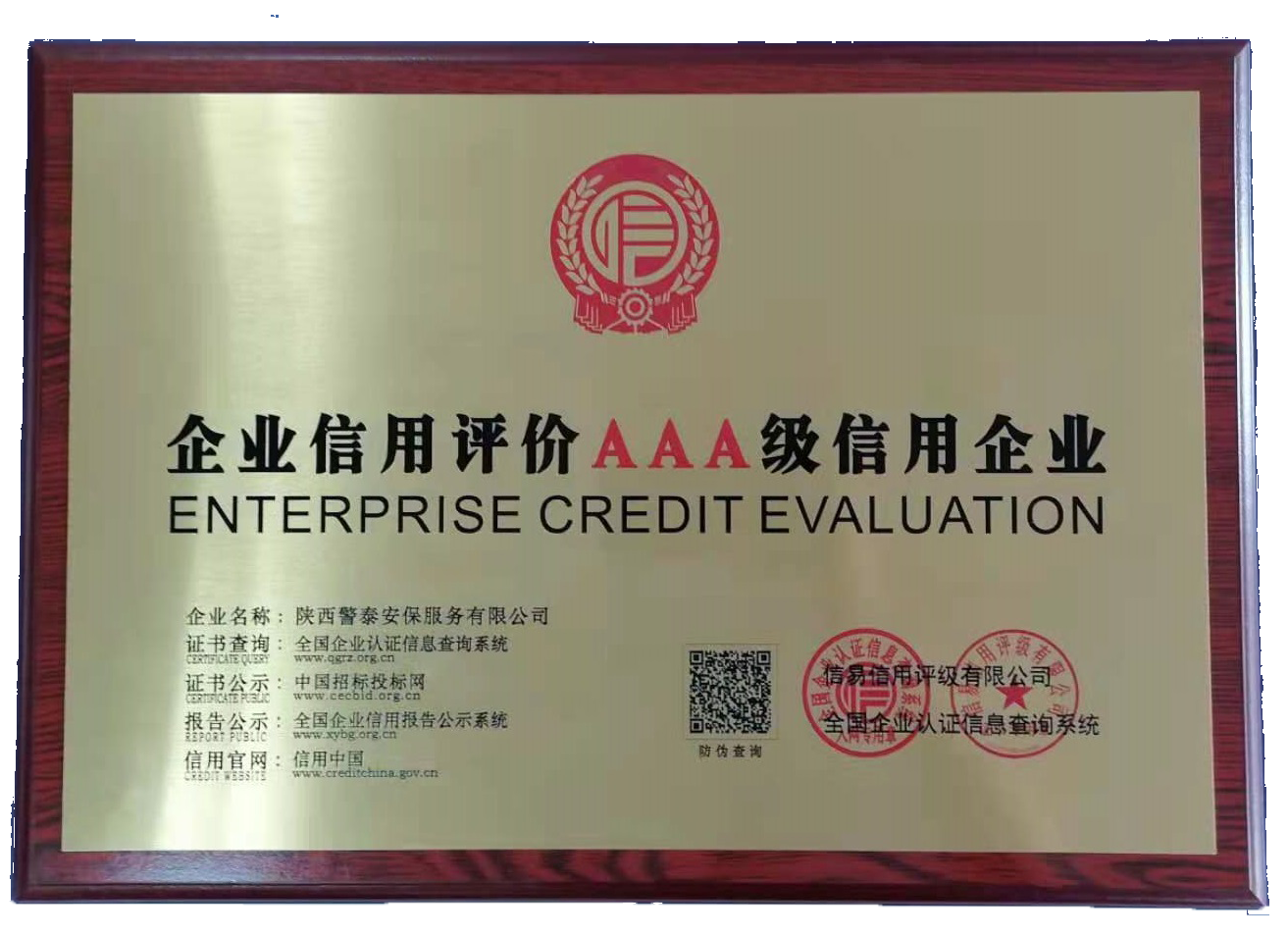 熱烈祝賀陜西警泰安保服務有限公司榮獲AAA級信